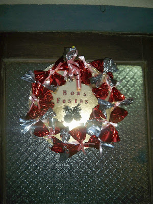 O aluminio era um vermelho e um em prateado, foram feitos laços, atados com fita de embrulho rosa (não tinha nem vermelho nem verde), colados á volta da base, com fita dupla face, foram também coladas 2 pequenas pinhas com cola quente, as letras foram desenhadas a caneta de acetato preta e preenchidas com verniz vermelho