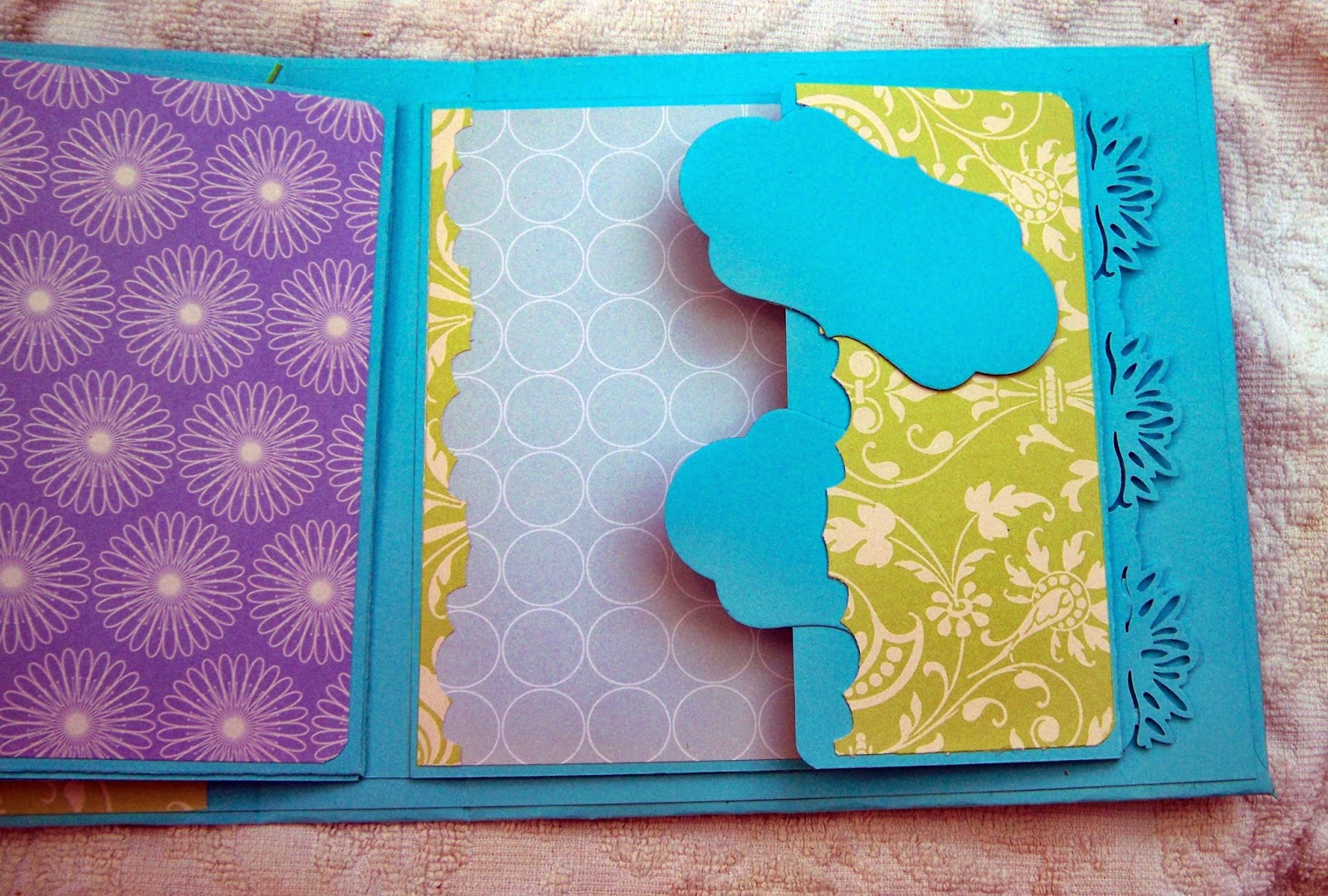 É um mini-álbum com 15 x 15 cm (6" x 6"), tem 4 folhas, todas com bolso interior, com photomat, e todas com uma aba.