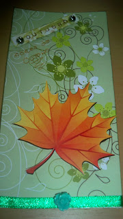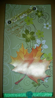 Tem como base cartão, forrado a cartolina, o fundo é um carimbo, o passaro, é outro carimbo com pó de embossing branco, aquela aplicação ao cimo á esq, é também um carimbo, mas com glossy, assim como o centro da flor, é carimbado e levou glossy, e 4 flores