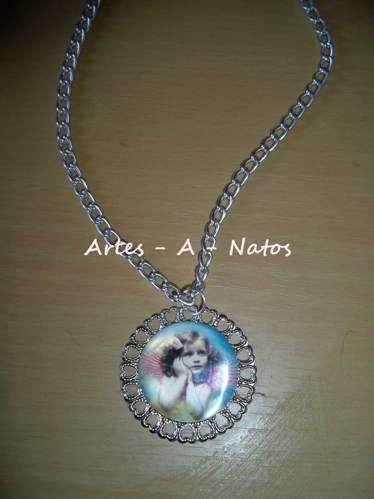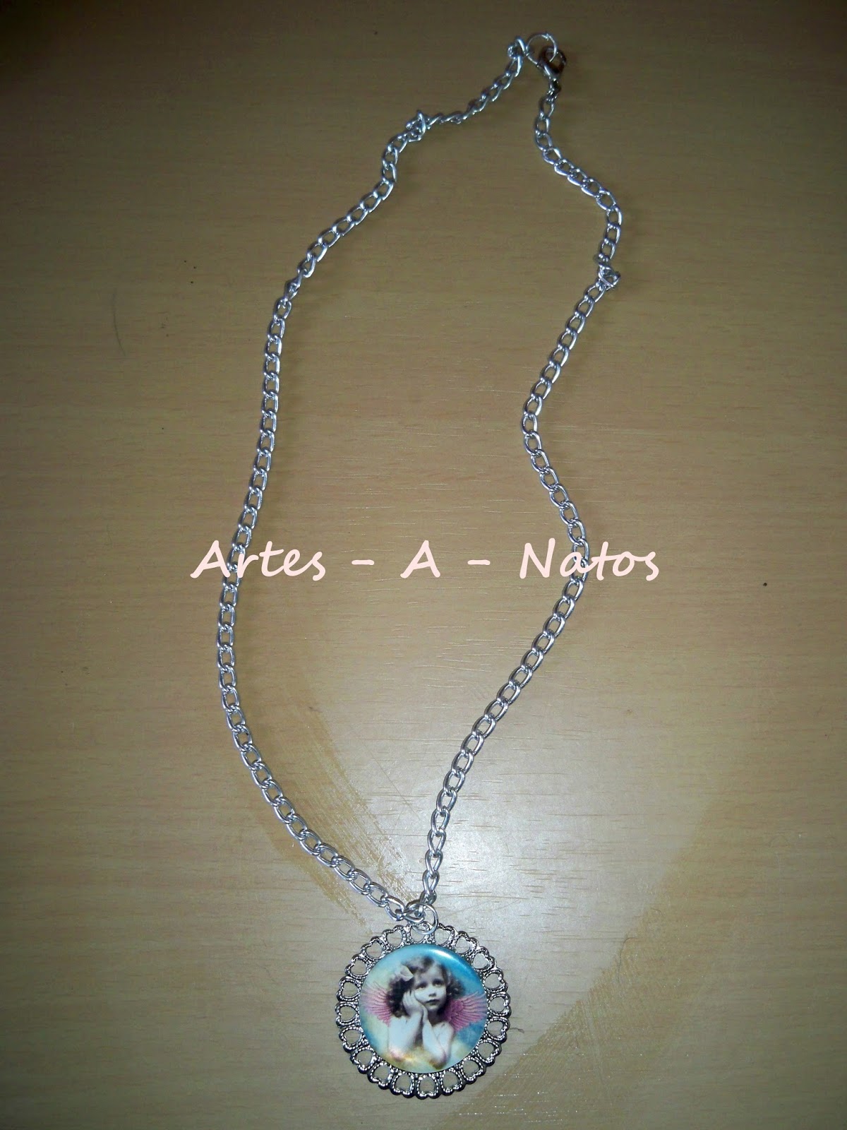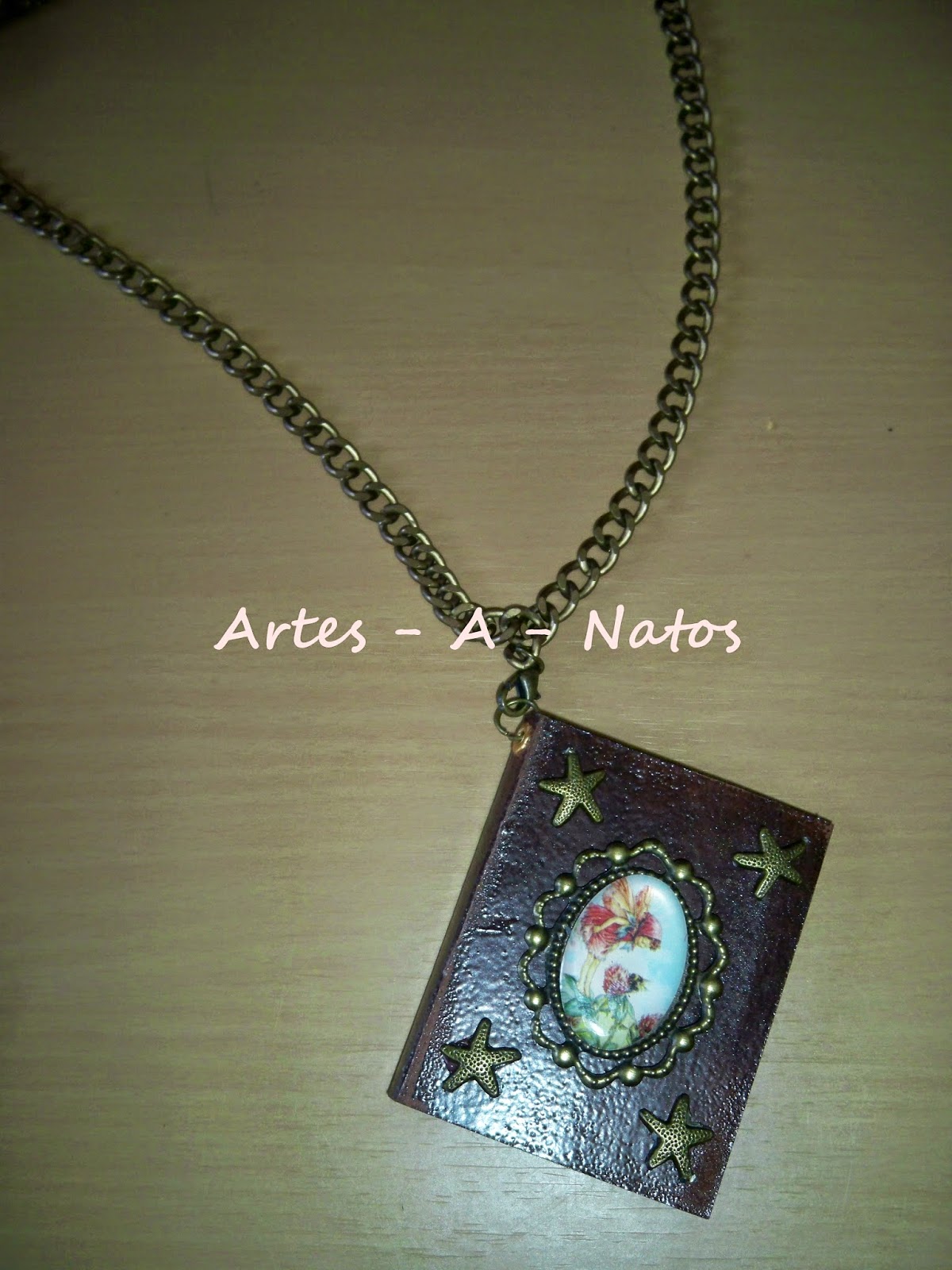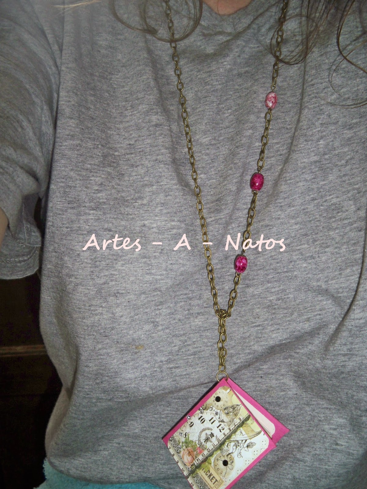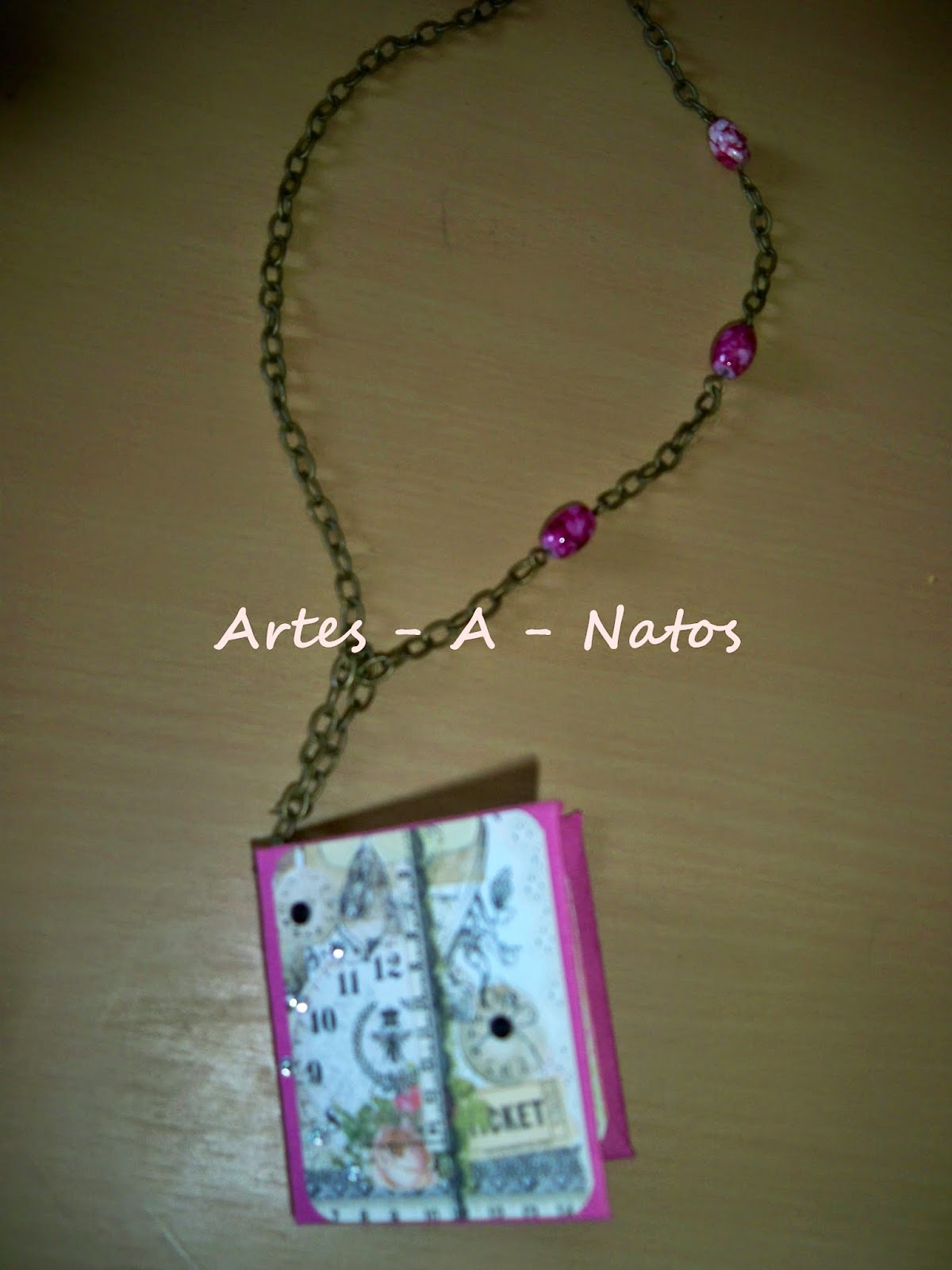 É um fio com um mini álbum, mesmo mini álbum tem cerca de 5x6cm, as folhas são feitas de papel de livro, dá para colar fotos tipo passe no interior