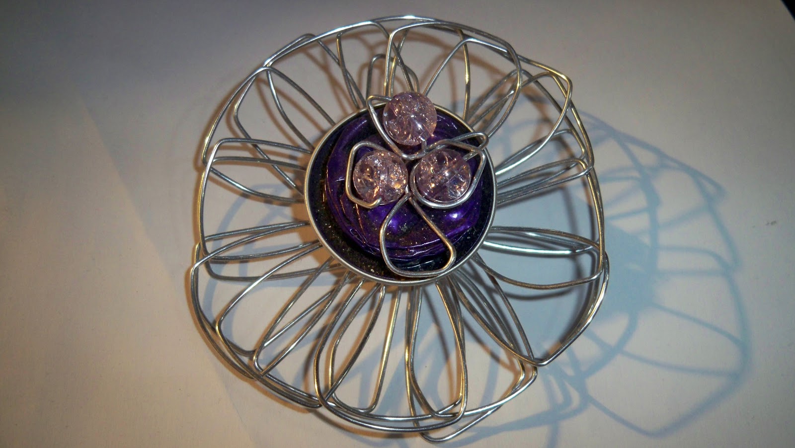 uma pregadeira em flor de arame e cápsula de nescafé, oferecida (juntamente com outras) pela